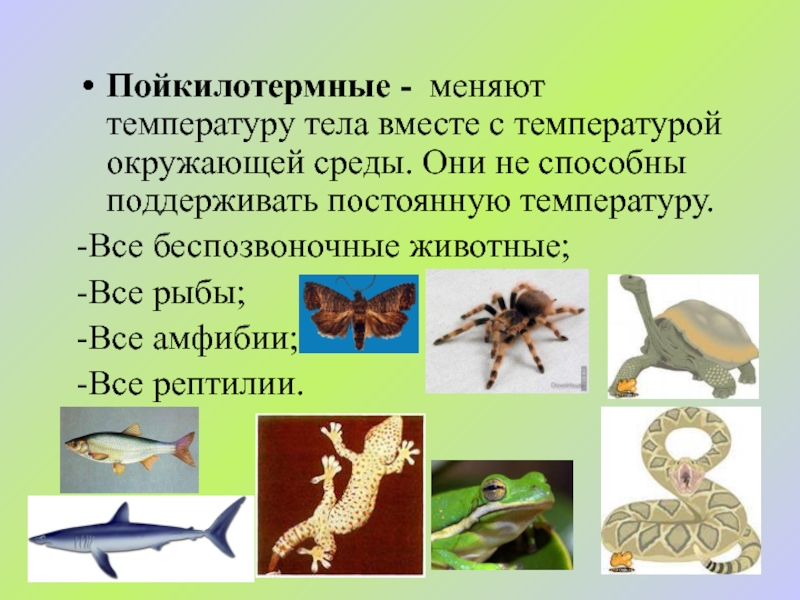 Слайд 12Пойкилотермные - меняют температуру тела вместе с температурой окружающей среды.