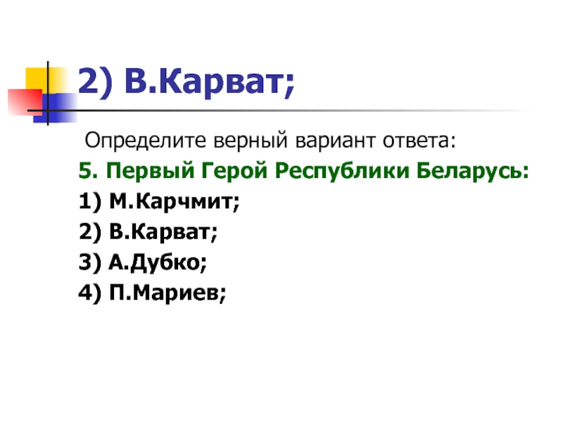 2) В.Карват; Определите верный вариант ответа:5. Первый Герой Республики Беларусь:1) М.Карчмит;2) В.Карват;3) А.Дубко;4) П.Мариев;