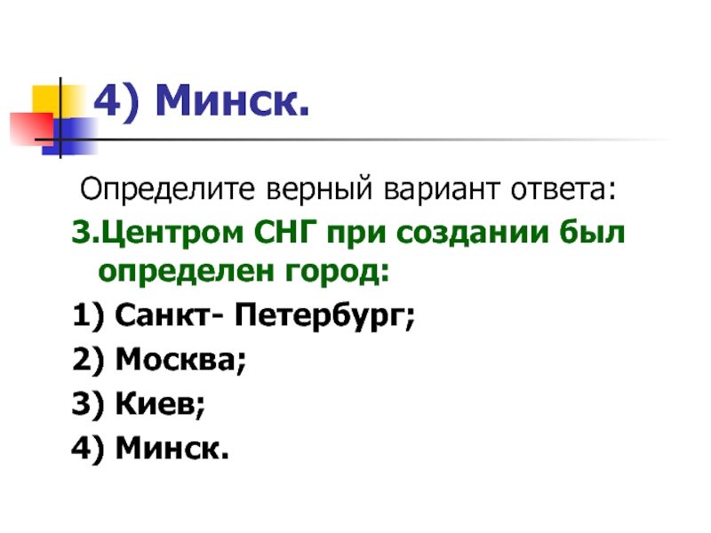 4) Минск. Определите верный вариант ответа:3.Центром СНГ при создании был определен город:1) Санкт- Петербург;2) Москва;3) Киев;4) Минск.