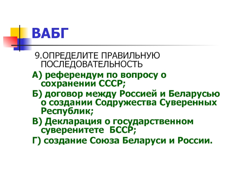 ВАБГ         9.ОПРЕДЕЛИТЕ ПРАВИЛЬНУЮ ПОСЛЕДОВАТЕЛЬНОСТЬА) референдум по вопросу о сохранении