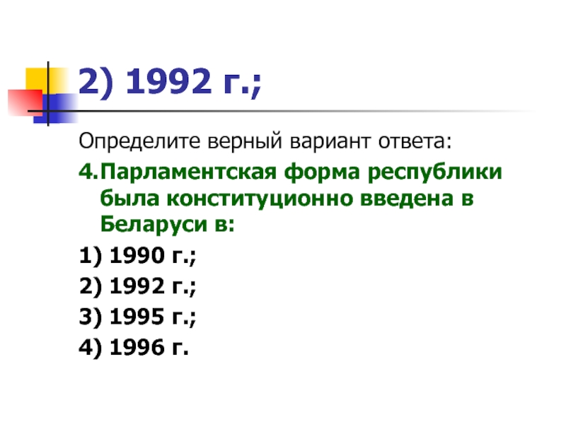 2) 1992 г.;Определите верный вариант ответа:4.Парламентская форма республики была конституционно введена в Беларуси в:1) 1990 г.;2) 1992