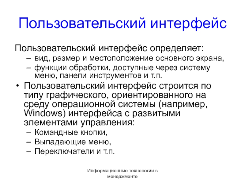 Пользовательский интерфейс строится по типу графического, ориентированного на среду операционной системы (например, Windows) интерфейса с развитыми элементами управления: