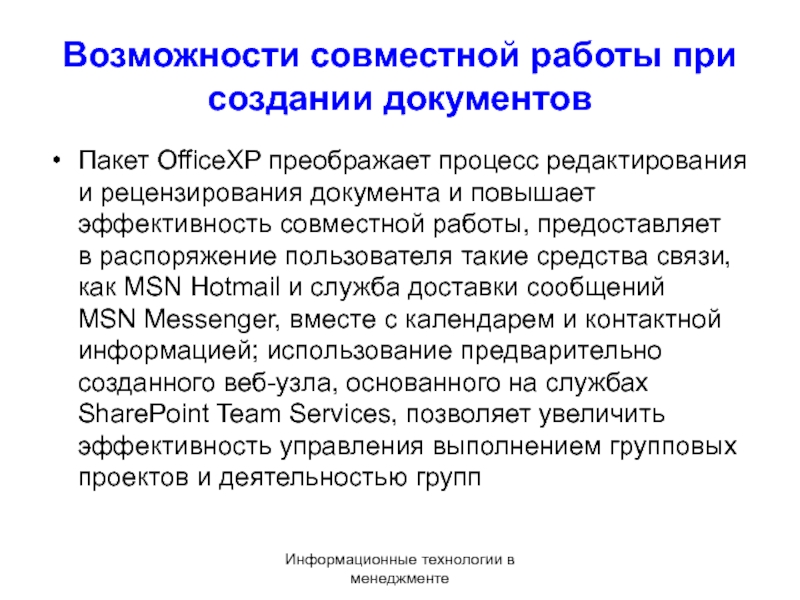 в распоряжение пользователя такие средства связи, как MSN Hotmail и служба доставки сообщений MSN Messenger, вместе с календарем и контактной информацией; использование предварительно созданного веб-узла, основанного на службах SharePoint Team Services, позволяет увеличить эффективность управления выполнением групповых проектов и деятельностью групп