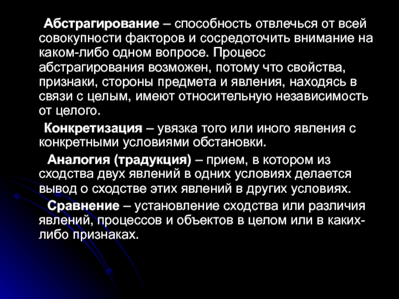 абстрагирование — выделение единства признаков, составляющих содержание понятия, из всей совокупности признаков предметов;