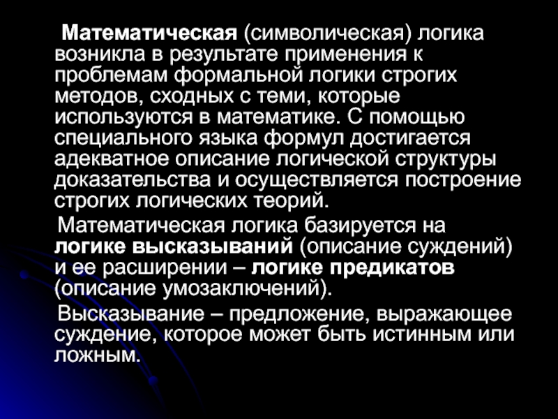 Математическая логика базируется на логике высказываний (описание суждений) и ее расширении – логике предикатов (описание умозаключений).