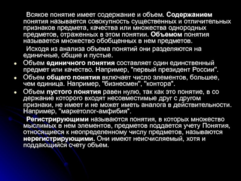 Регистрирующими называются понятия, в которых множество мыслимых в нем элементов, предметов поддается учету Понятия, относящиеся к неопределенному числу предметов, называются нерегистрирующими. Они имеют неисчисляемый, хотя и поддающийся счету объем.