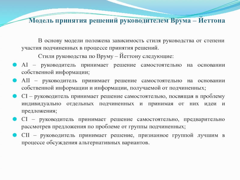 Слайд 7Модель принятия решений руководителем Врума – Йеттона