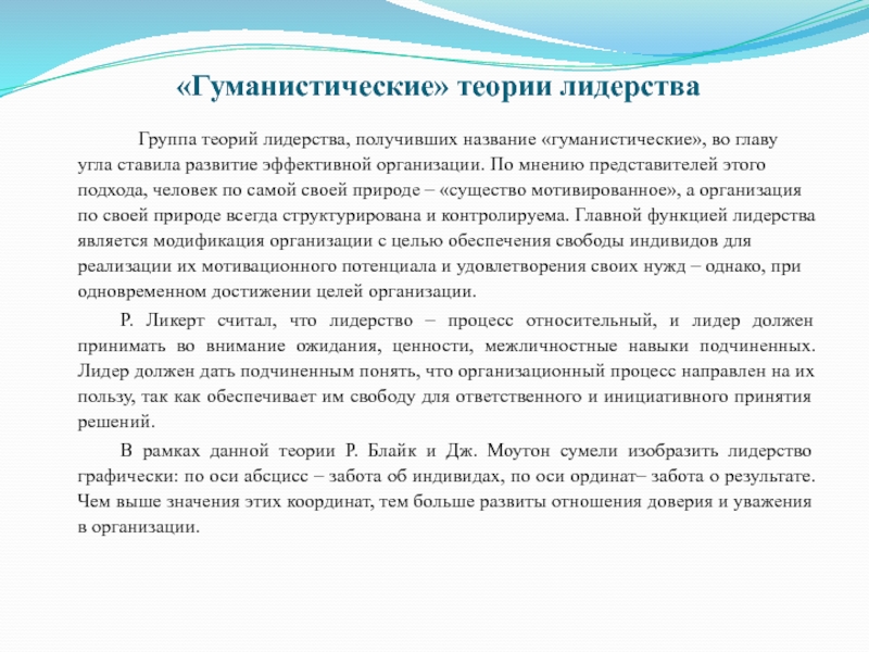 Группа теорий лидерства, получивших название «гуманистические», во главу