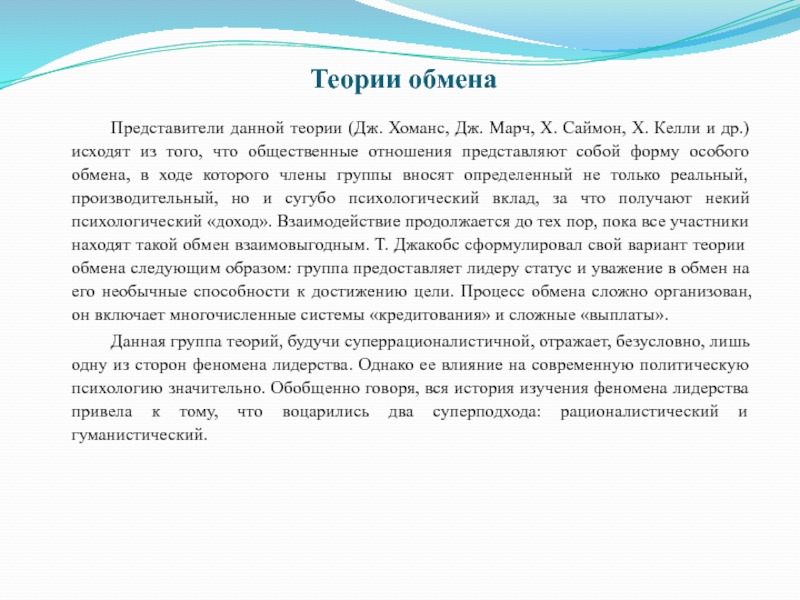 представляют собой форму особого обмена, в ходе которого члены группы вносят определенный не только реальный, производительный, но и сугубо психологический вклад, за что получают некий психологический «доход». Взаимодействие продолжается до тех пор, пока все участники находят такой обмен взаимовыгодным. Т. Джакобс сформулировал свой вариант теории обмена следующим образом: группа предоставляет лидеру статус и уважение в обмен на его необычные способности к достижению цели. Процесс обмена сложно организован, он включает многочисленные системы «кредитования» и сложные «выплаты».