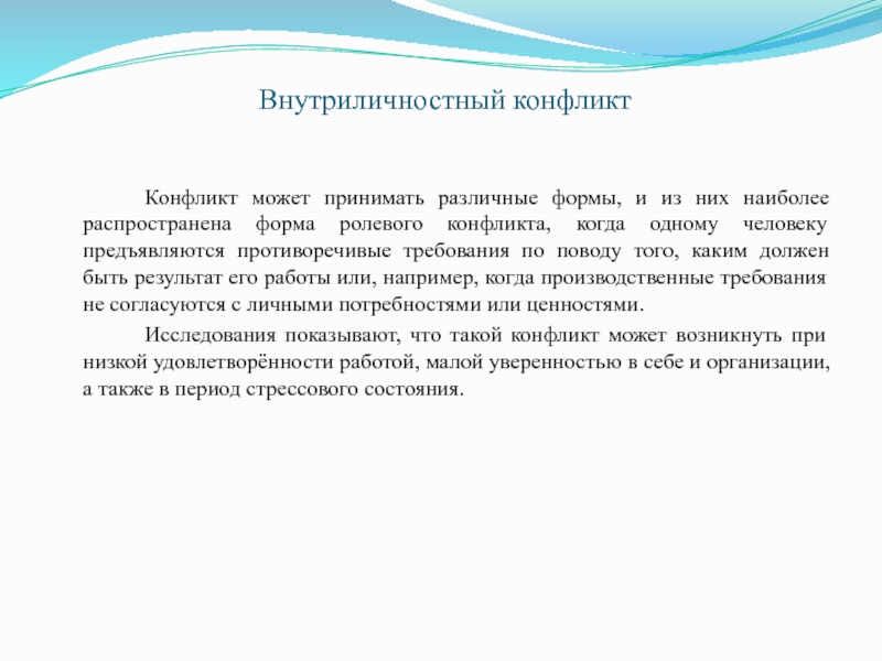 Исследования показывают, что такой конфликт может возникнуть при низкой удовлетворённости работой, малой уверенностью в себе и организации, а также в период стрессового состояния.