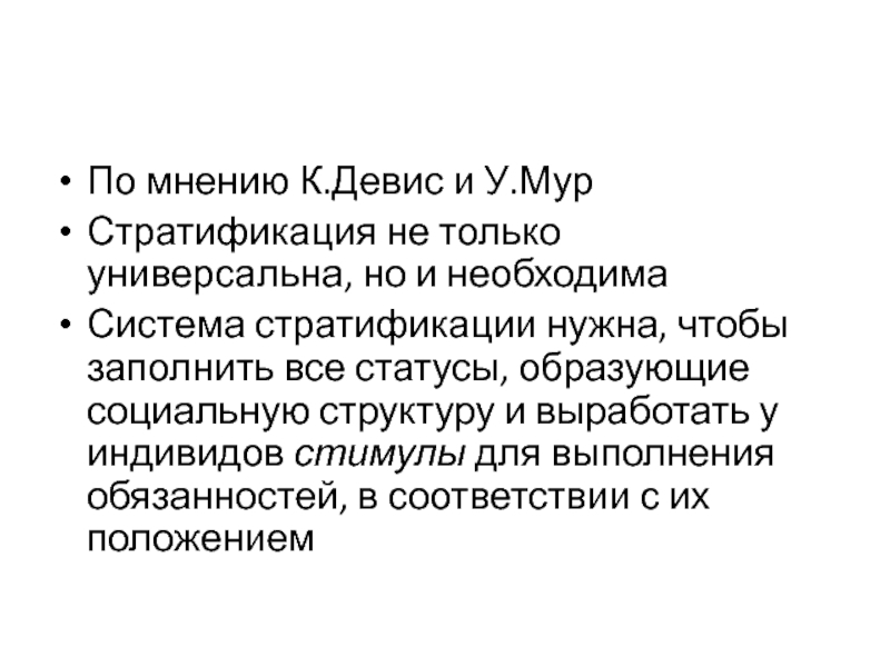 По мнению К.Девис и У.МурСтратификация не только универсальна, но и необходимаСистема стратификации нужна, чтобы заполнить все статусы,