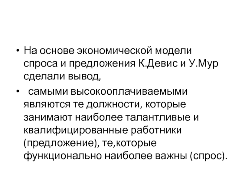 На основе экономической модели спроса и предложения К.Девис и У.Мур сделали вывод, самыми высокооплачиваемыми являются те должности,