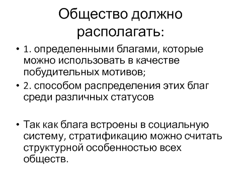 Общество должно располагать:1. определенными благами, которые можно использовать в качестве побудительных мотивов;2. способом распределения этих благ среди