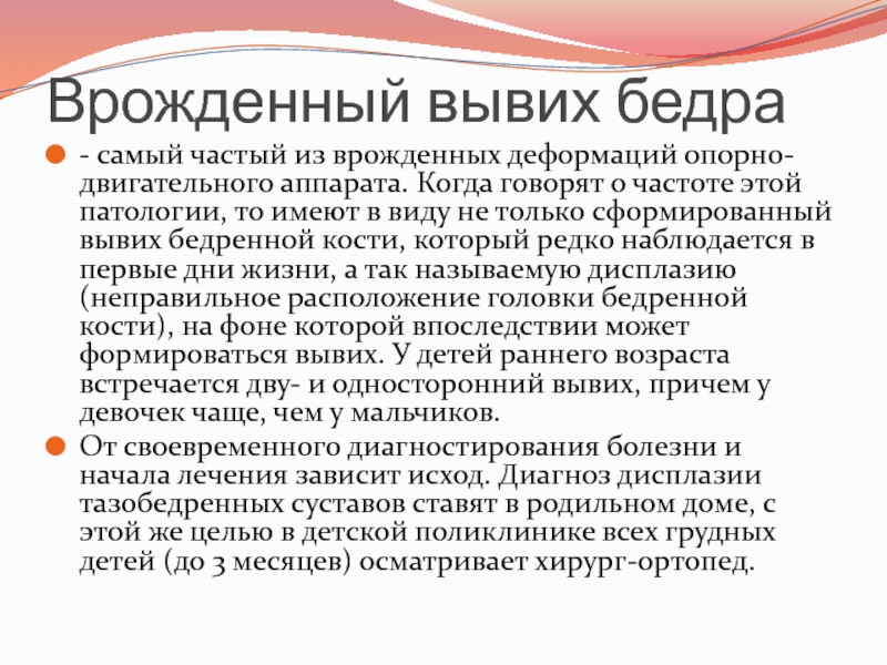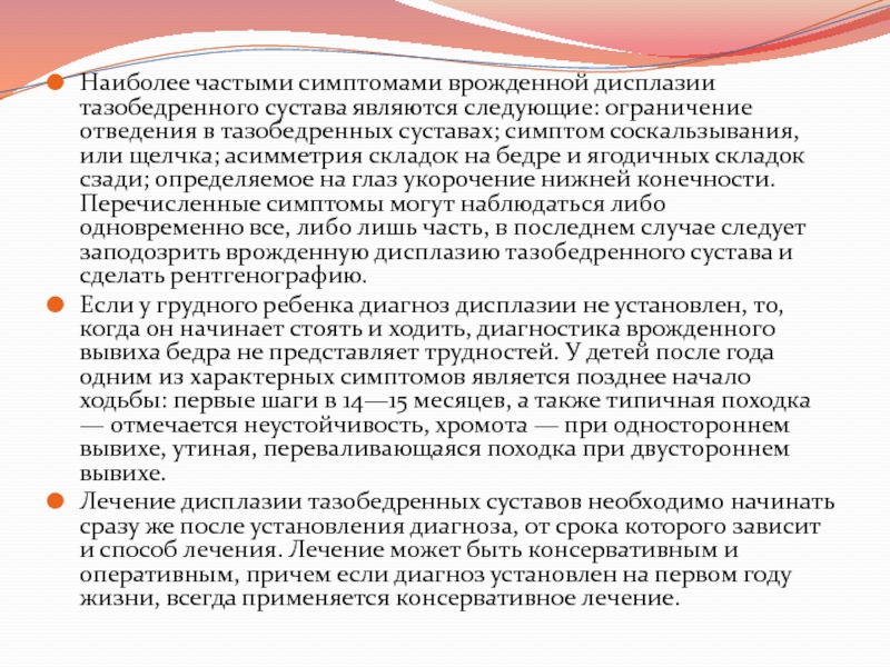 Слайд 95Наиболее частыми симптомами врожденной дисплазии тазобедренного сустава являются следующие: ограничение