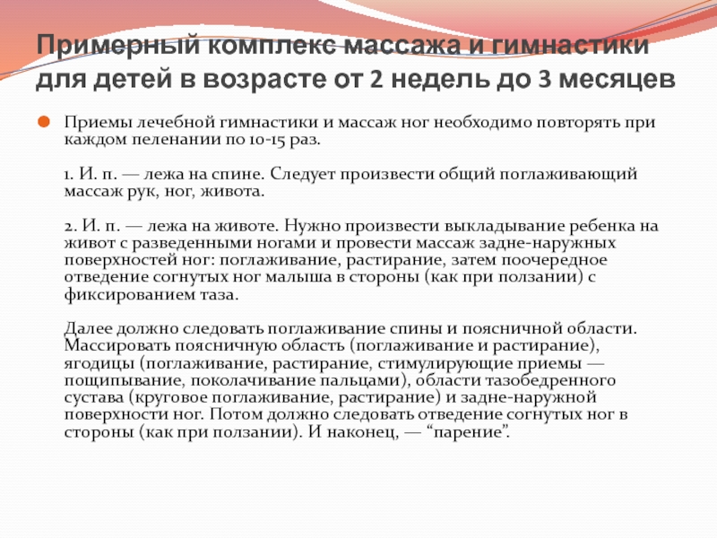 Примерный комплекс массажа и ЛГ при мышечной кривошее (возраст ребенка от 2 до 3 месяцев):