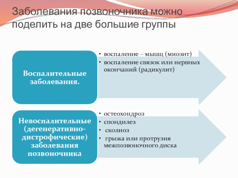 Слайд 4Заболевания позвоночника можно поделить на две большие группы