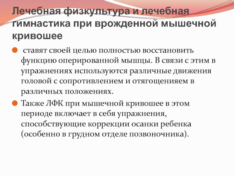Также ЛФК при мышечной кривошее в этом периоде включает в себя упражнения, способствующие коррекции осанки ребенка (особенно в грудном отделе позвоночника).