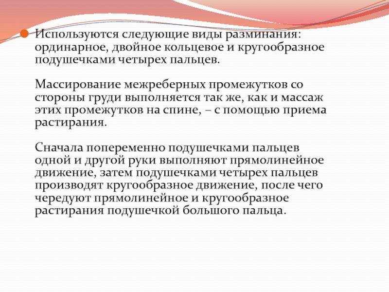 Воздействие на межреберные промежутки предусматривает использование таких массажных приемов, как прямолинейное растирание, производимое подушечками пальцев попеременно то одной, то другой рукой; прямолинейное и кругообразное растирание, выполняемое сначала подушечками четырех пальцев, а затем подушечкой большого пальца.