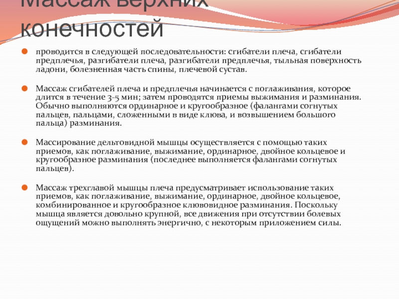 Нельзя обойти вниманием и массаж верхних конечностей, особенно он необходим при чрезмерном напряжении мускулатуры спины и при гипотрофии мышц рук.