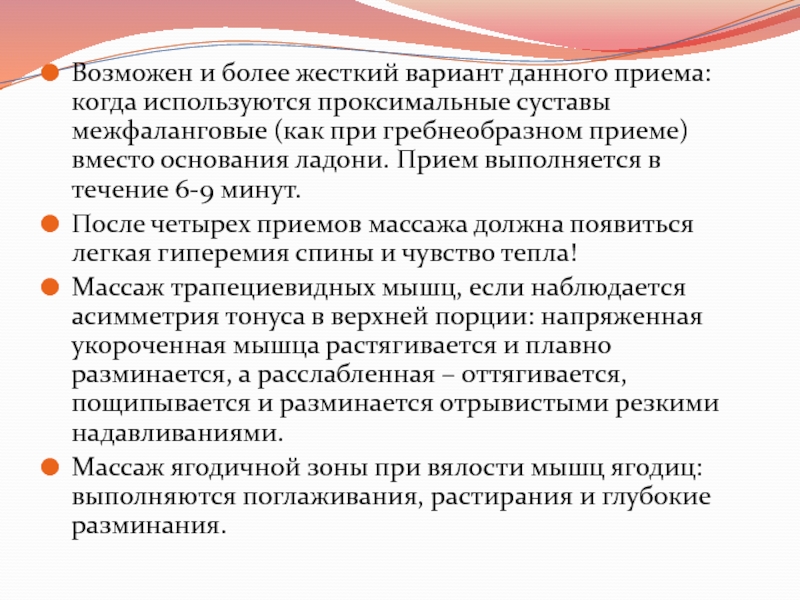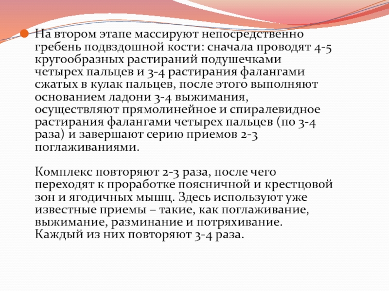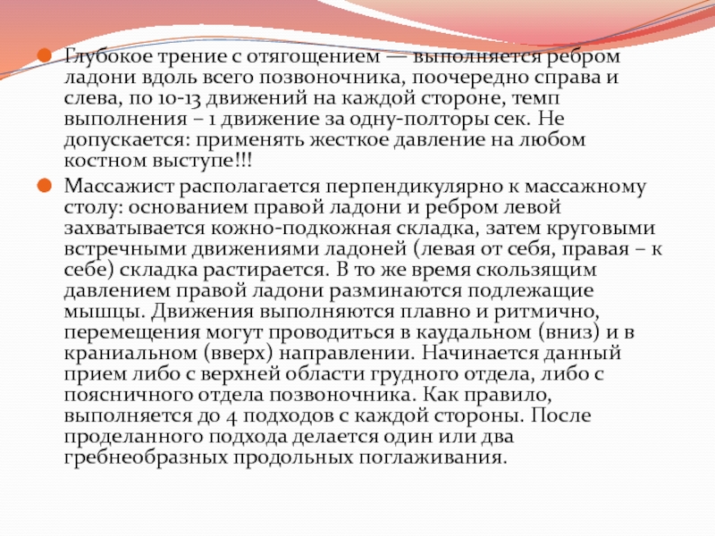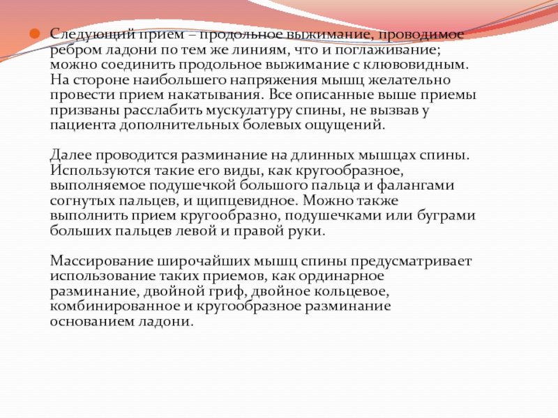 Слайд 16Следующий прием – продольное выжимание, проводимое ребром ладони по тем