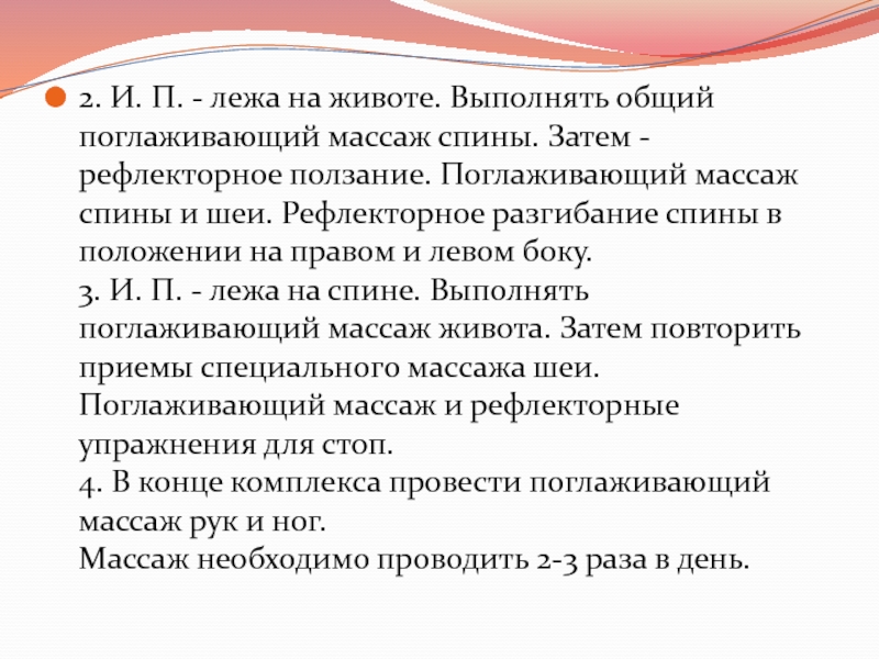 Слайд 842. И. П. - лежа на животе. Выполнять общий поглаживающий