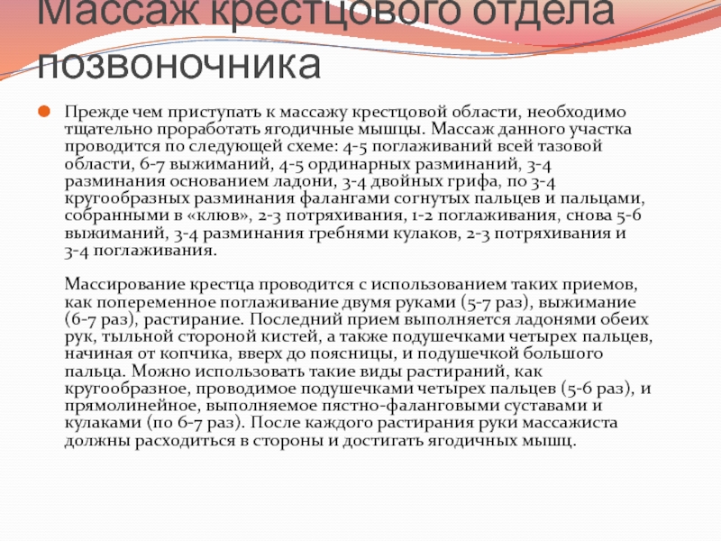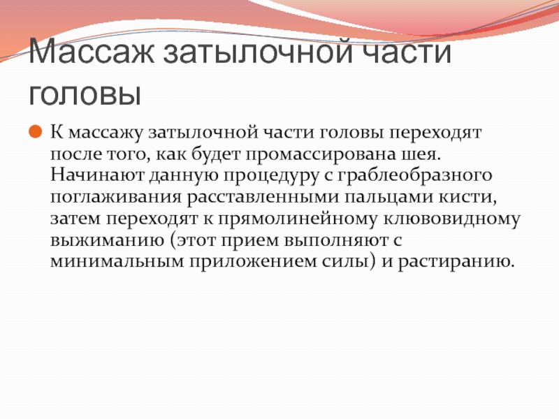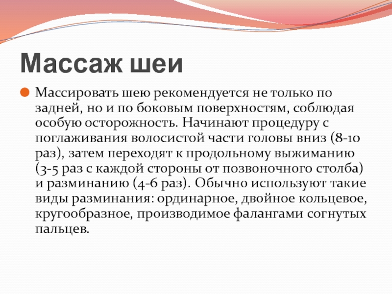 волосистой части головы вниз (8-10 раз), затем переходят к продольному выжиманию (3-5 раз с каждой стороны от позвоночного столба) и разминанию (4-6 раз). Обычно используют такие виды разминания: ординарное, двойное кольцевое, кругообразное, производимое фалангами согнутых пальцев.