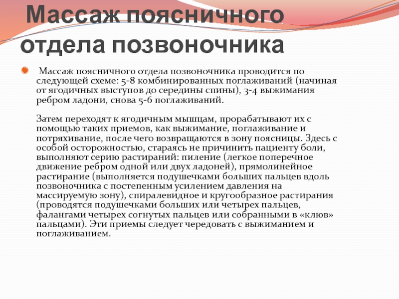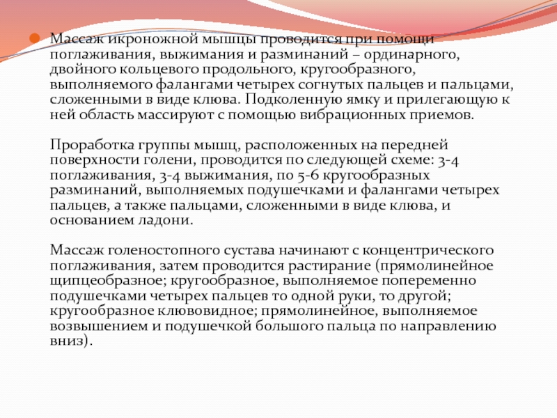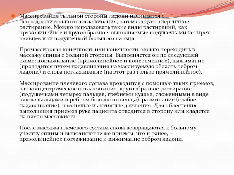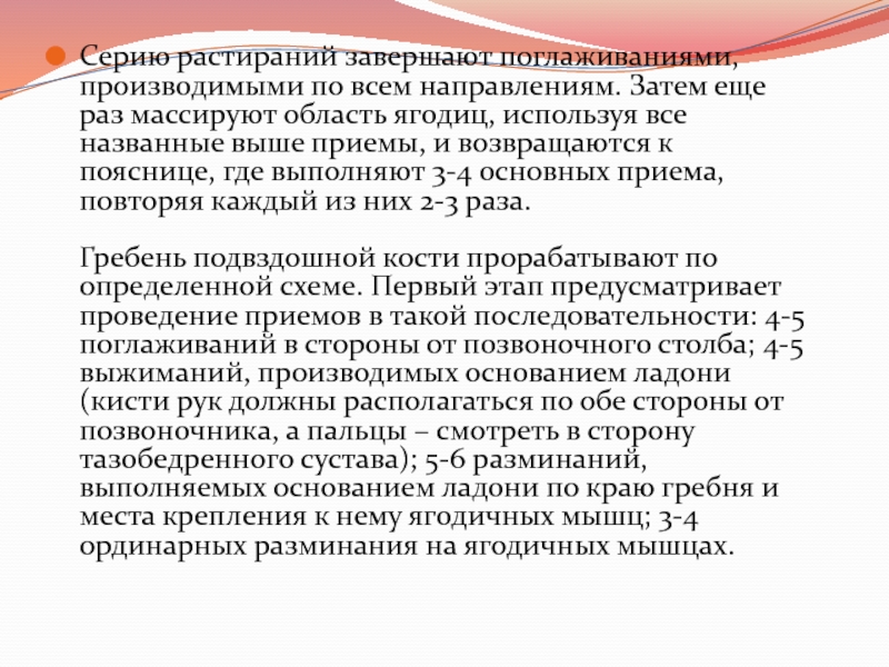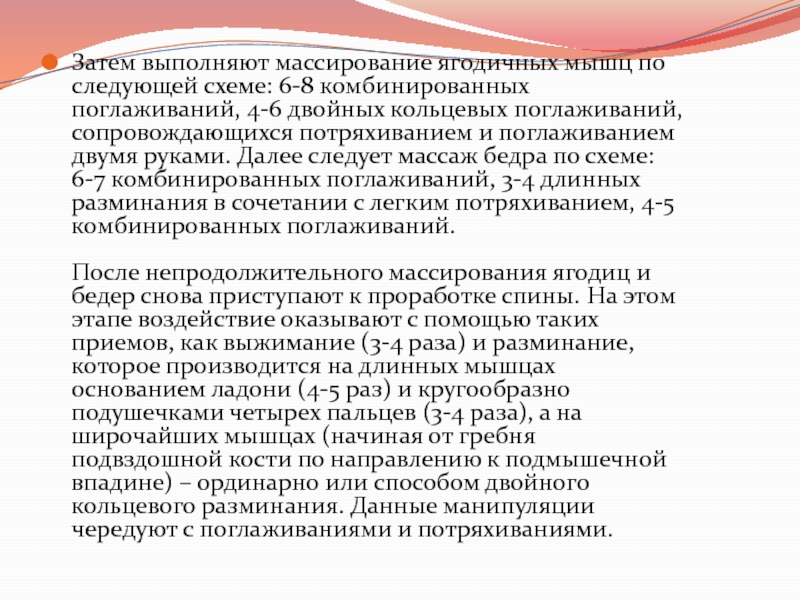 предварительной пальпации. Рекомендуется сочетать разминания с поглаживаниями (например, 4-6 разминаний, 3-5 поглаживаний, затем снова 4-6 разминаний и еще раз 3-5 поглаживаний, после чего можно перейти к растиранию).