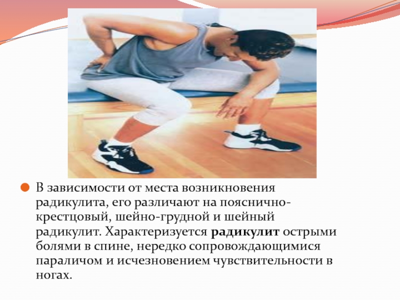 Слайд 11В зависимости от места возникновения радикулита, его различают на пояснично-крестцовый,