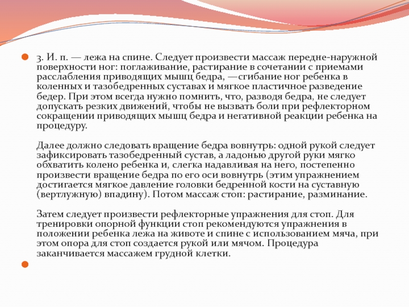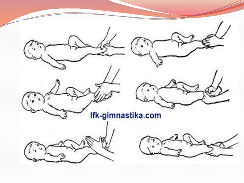 приводящих мышц бедра, —сгибание ног ребенка в коленных и тазобедренных суставах и мягкое пластичное разведение бедер. При этом всегда нужно помнить, что, разводя бедра, не следует допускать резких движений, чтобы не вызвать боли при рефлекторном сокращении приводящих мышц бедра и негативной реакции ребенка на процедуру.