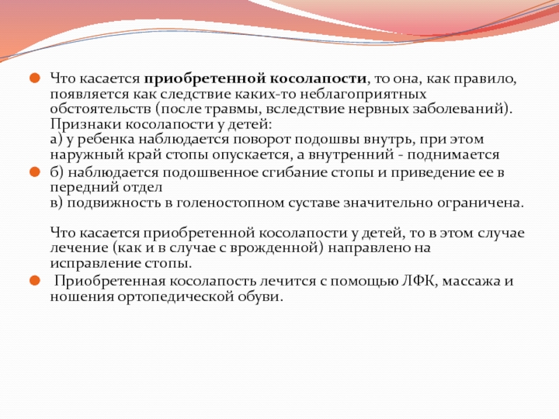 Слайд 86Что касается приобретенной косолапости, то она, как правило, появляется как