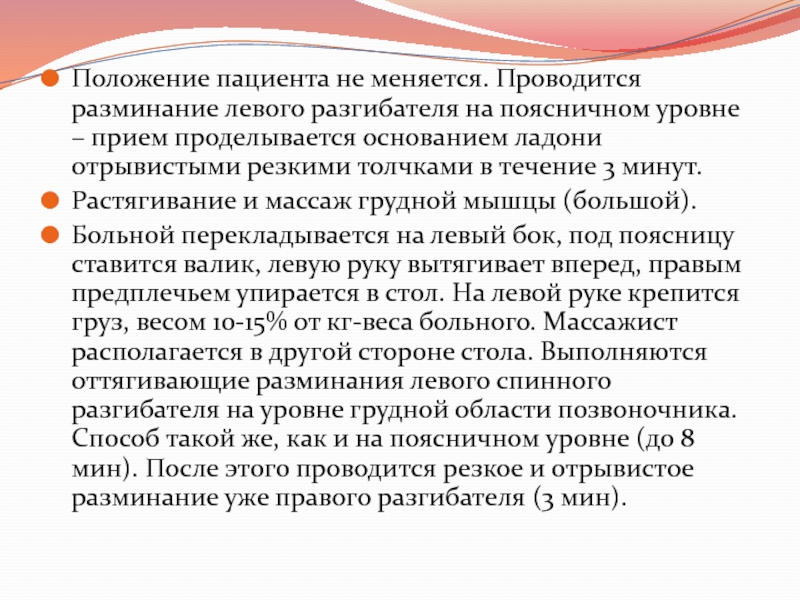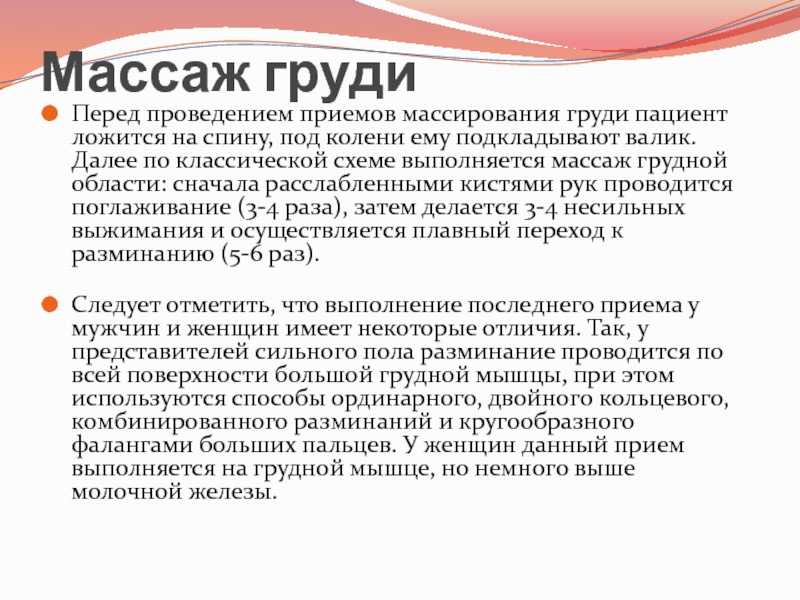 2. Расслабляющие приемы на грудной клетке, такие как поглаживание и растирание должны осуществляться на больной стороне сначала в верхней части груди, а затем - в нижней.