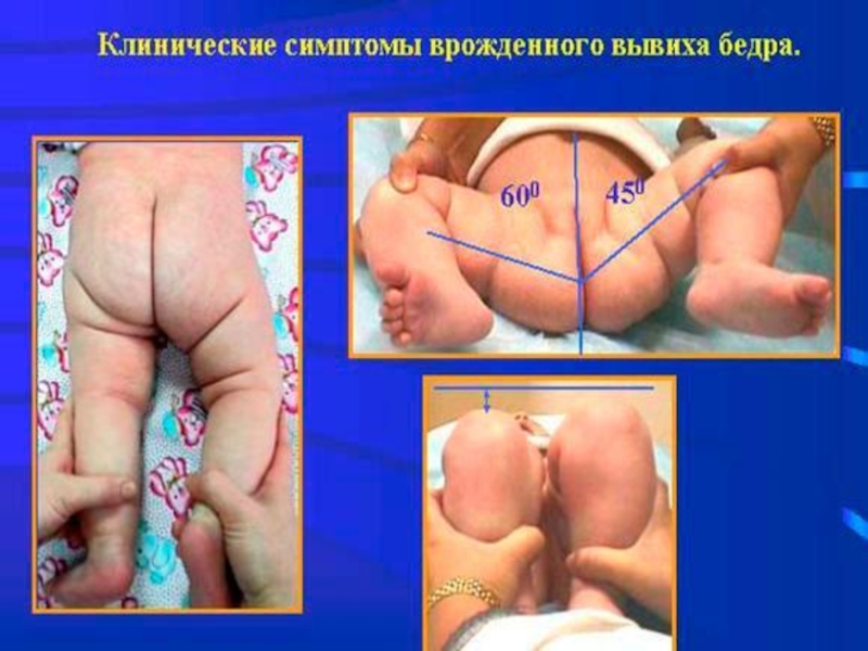 на бедре и ягодичных складок сзади; определяемое на глаз укорочение нижней конечности. Перечисленные симптомы могут наблюдаться либо одновременно все, либо лишь часть, в последнем случае следует заподозрить врожденную дисплазию тазобедренного сустава и сделать рентгенографию.