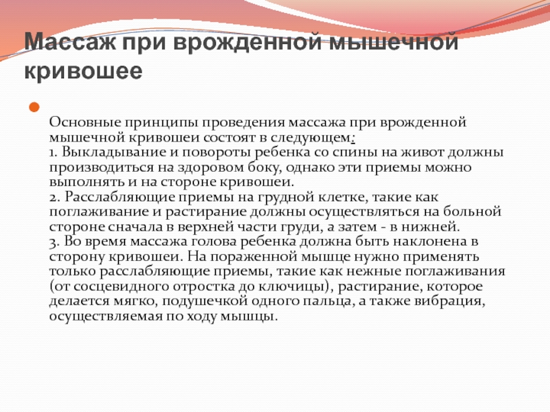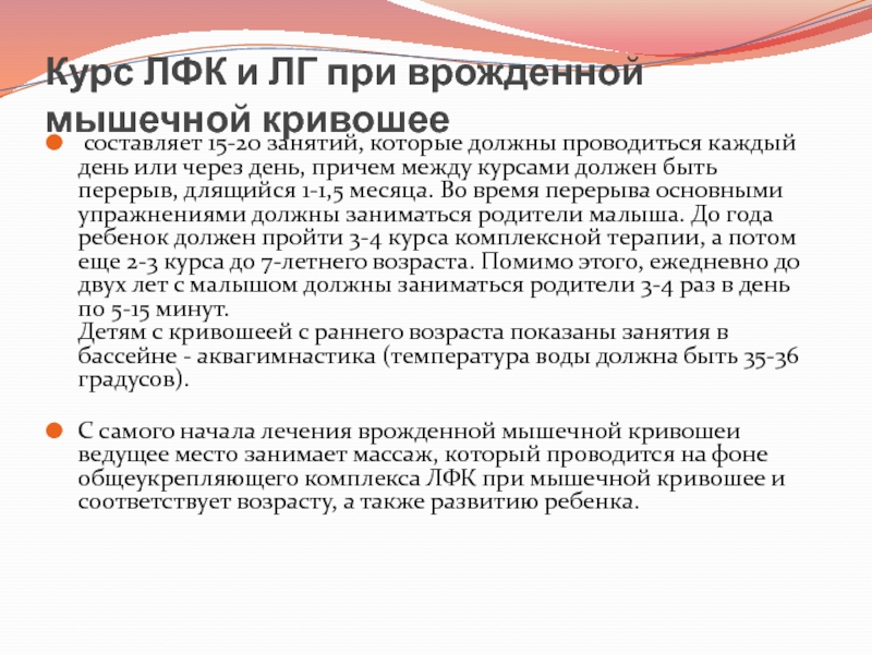 С самого начала лечения врожденной мышечной кривошеи ведущее место занимает массаж, который проводится на фоне общеукрепляющего комплекса ЛФК при мышечной кривошее и соответствует возрасту, а также развитию ребенка.