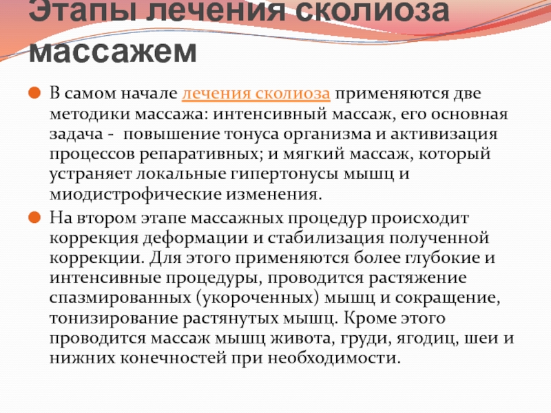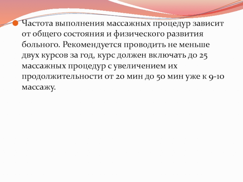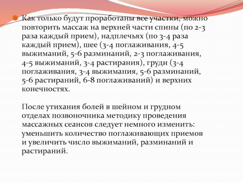 4) уменьшение напряжения в мускулатуре шеи и спины; размягчение соединительной ткани путем интенсивного поверхностного поглаживания и разминания.