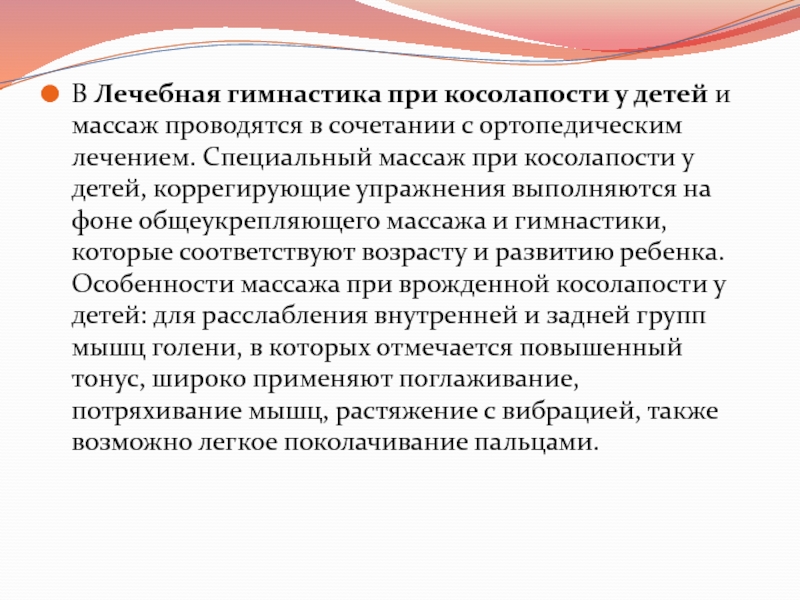 Слайд 87В Лечебная гимнастика при косолапости у детей и массаж проводятся в