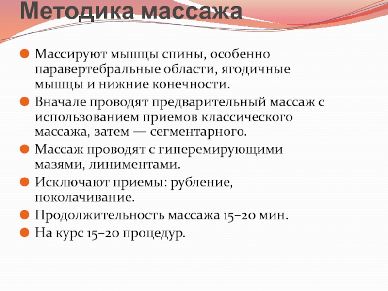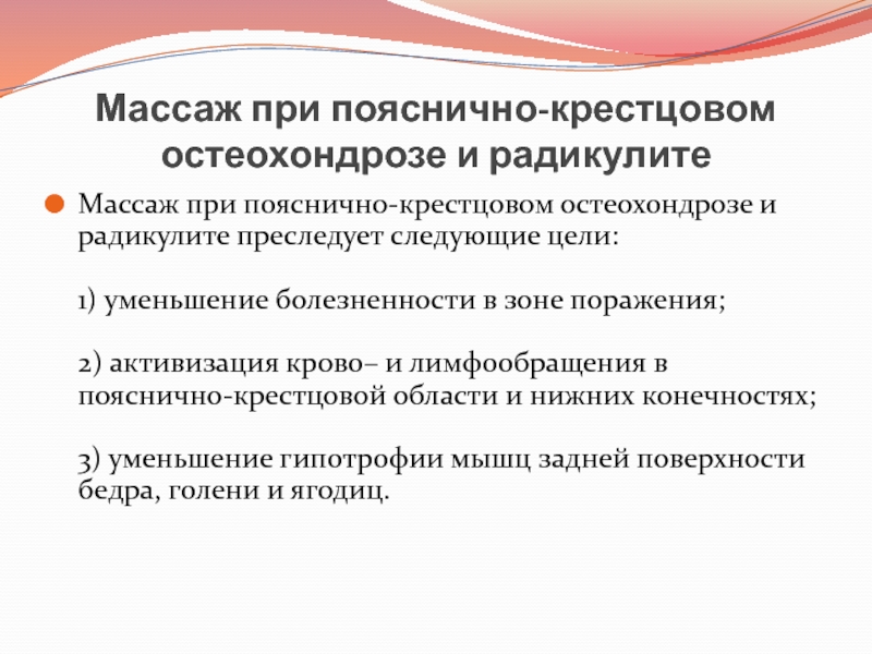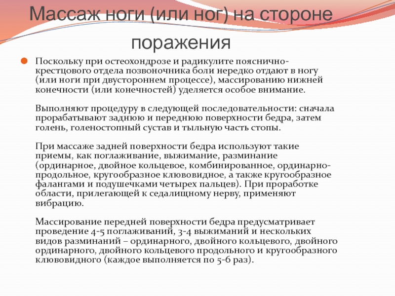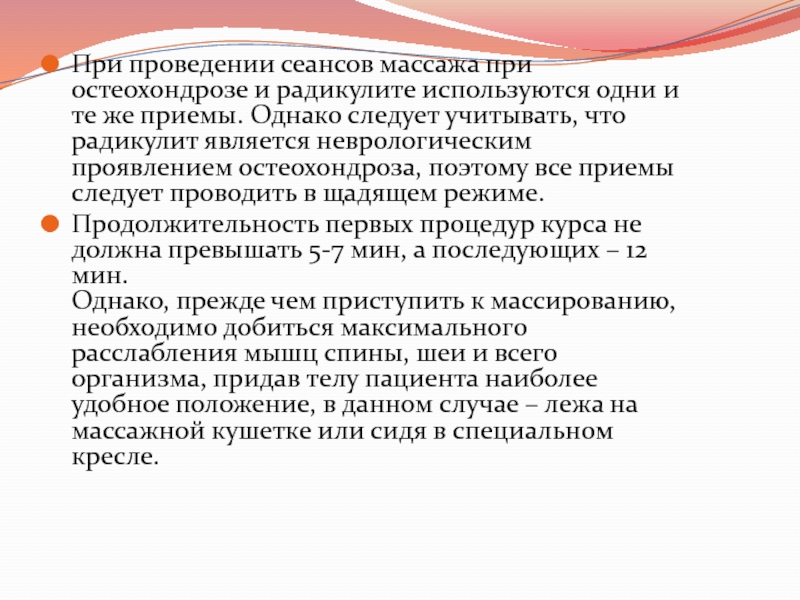 Слайд 14При проведении сеансов массажа при остеохондрозе и радикулите используются одни