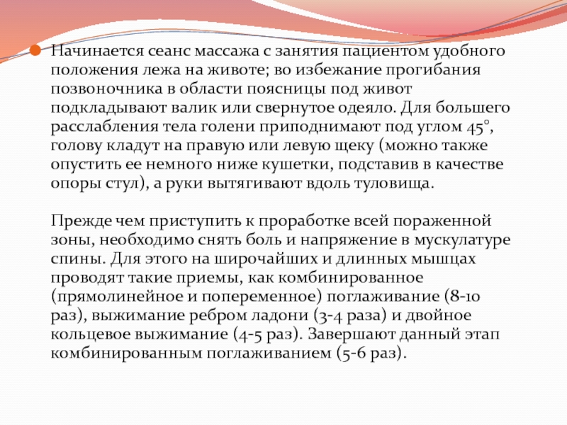 Сеанс начинается с принятия больным положения лежа на животе. Затем проводится поглаживание всей спины; используются такие его виды, как прямолинейное и попеременное поглаживания.