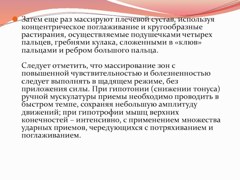 по надплечьям и растирание, а также пощипывание, пунктирование, поколачивание в области лопатки.