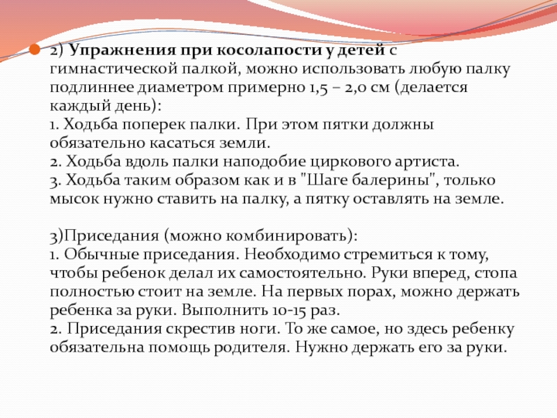 Слайд 892) Упражнения при косолапости у детей с гимнастической палкой, можно использовать любую