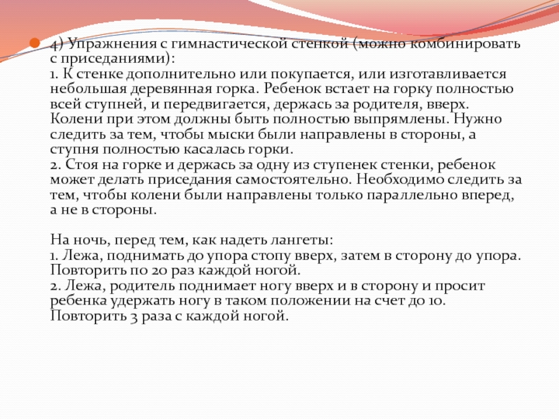 2. Стоя на горке и держась за одну из ступенек стенки, ребенок может делать приседания самостоятельно. Необходимо следить за тем, чтобы колени были направлены только параллельно вперед, а не в стороны.