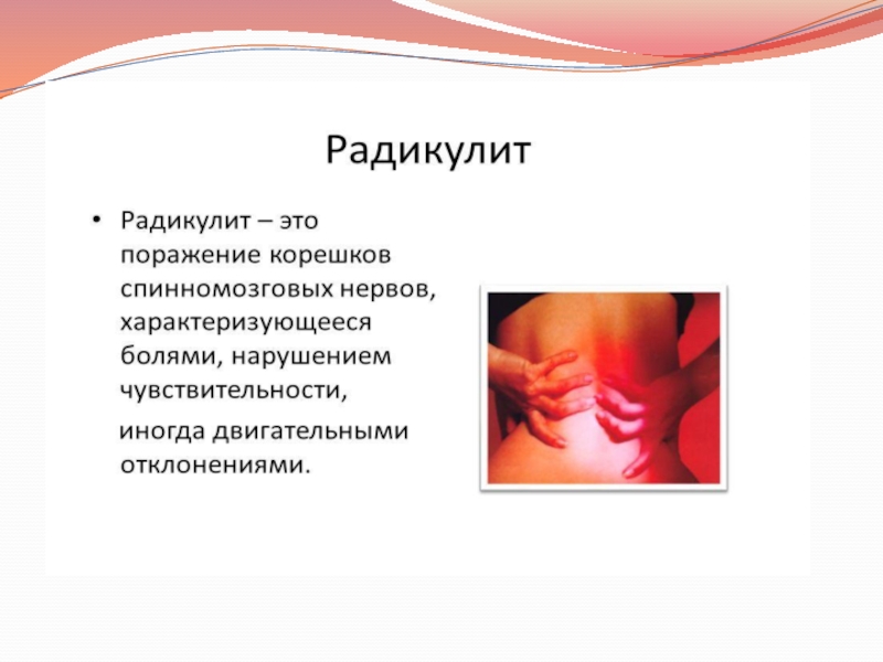 шейно-грудной и шейный радикулит. Характеризуется радикулит острыми болями в спине, нередко сопровождающимися