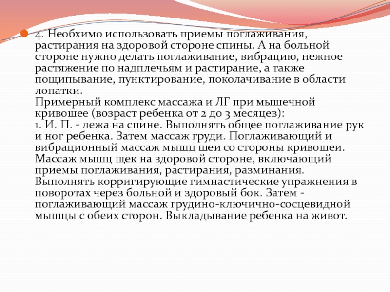 1. И. П. - лежа на спине. Выполнять общее поглаживание рук и ног ребенка. Затем массаж груди. Поглаживающий и вибрационный массаж мышц шеи со стороны кривошеи. Массаж мышц щек на здоровой стороне, включающий приемы поглаживания, растирания, разминания. Выполнять корригирующие гимнастические упражнения в поворотах через больной и здоровый бок. Затем - поглаживающий массаж грудино-ключично-сосцевидной мышцы с обеих сторон. Выкладывание ребенка на живот.