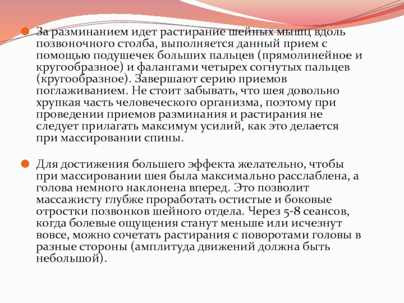 Слайд 20За разминанием идет растирание шейных мышц вдоль позвоночного столба, выполняется
