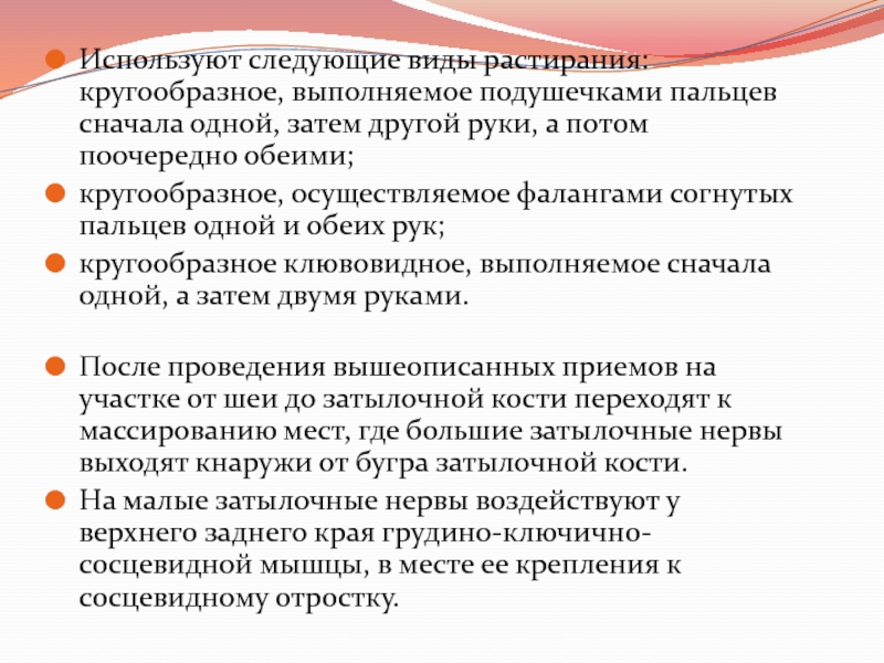 Слайд 22Используют следующие виды растирания: кругообразное, выполняемое подушечками пальцев сначала одной,