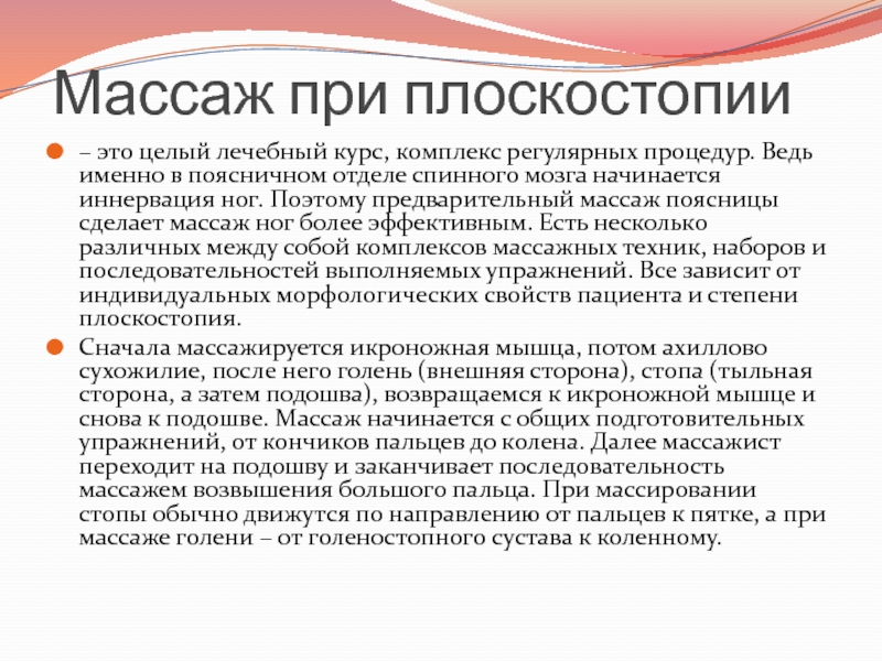 Понятие о плоскостопии, причины возникновения, меры профилактики. Лечение плоскостопия. Методика массажа и лечебной гимнастики.