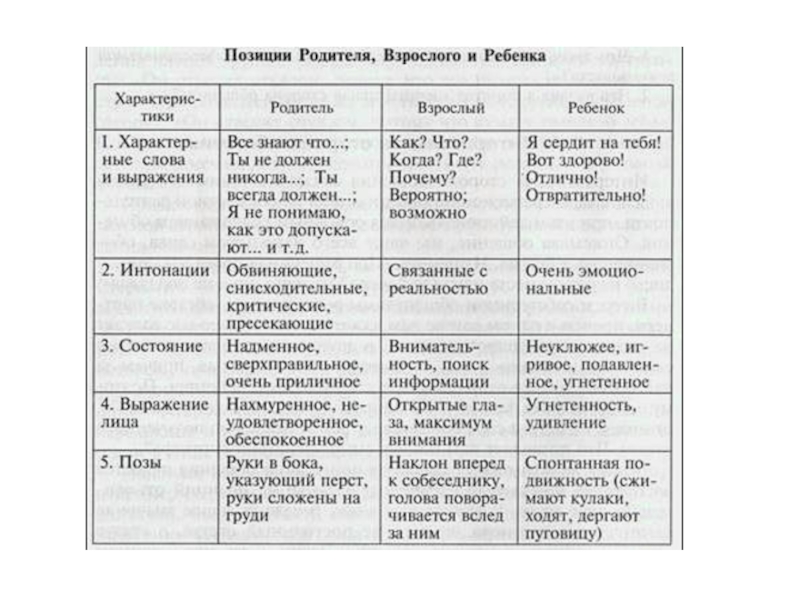 -Взрослый – необходим для выживания Ребенка. Что желает Р-В выполняет. Контролирует Р и Род. Воспринимает реальность, получение объективной информации, организованный, приспособленный, находчивый, спокойный. Без эмоций.