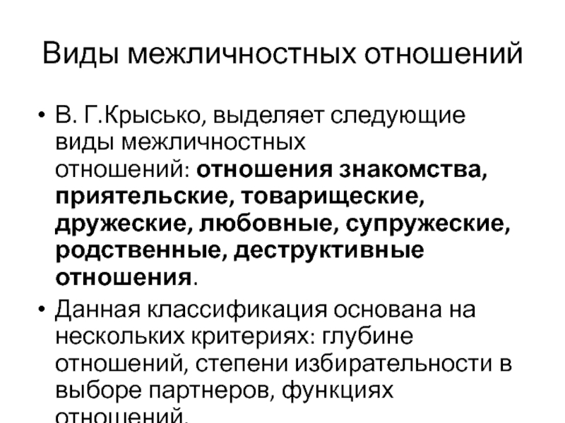 В. Г.Крысько, выделяет следующие виды межличностных отношений: отношения знакомства, приятельские,