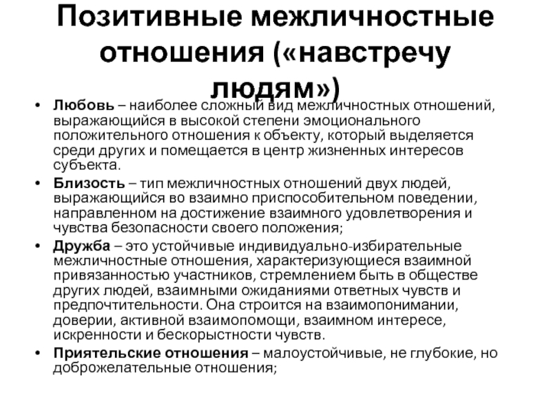 Слайд 7Позитивные межличностные отношения («навстречу людям»)
