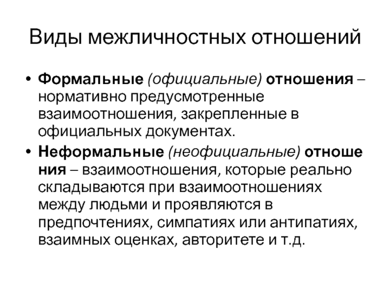 Формальные (официальные) отношения – нормативно предусмотренные взаимоотношения, закрепленные в официальных документах.