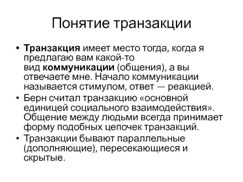 Берн считал транзакцию «основной единицей социального взаимодействия». Общение между людьми всегда принимает форму подобных цепочек транзакций.